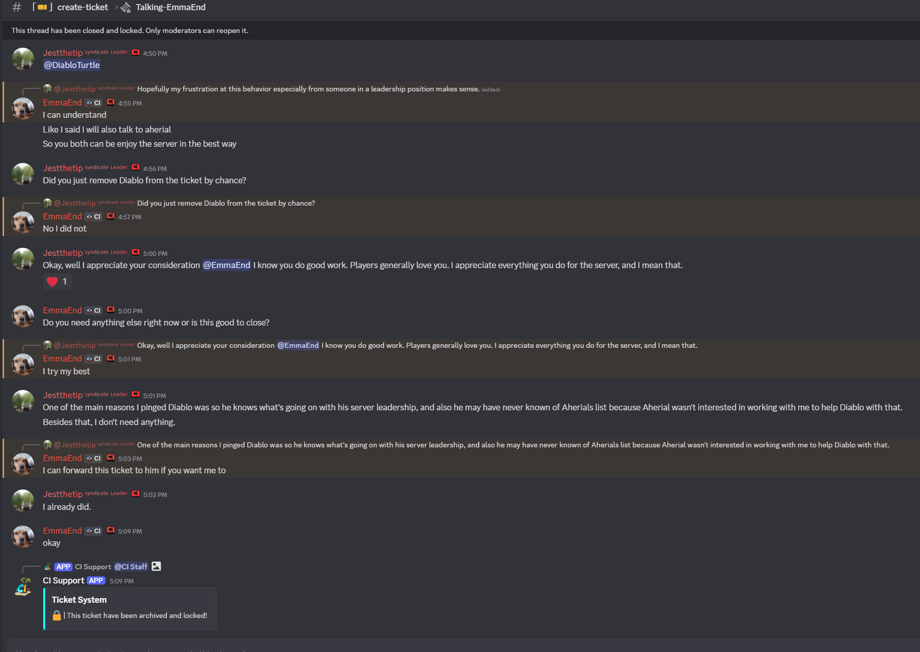 Despite this, Aherial submitted a ticket requesting that a specific player (Jest) be prohibited from communicating with her again. The interaction in question lasted less than five minutes, involved a legitimate question, and did not include any repeated or inappropriate behavior.